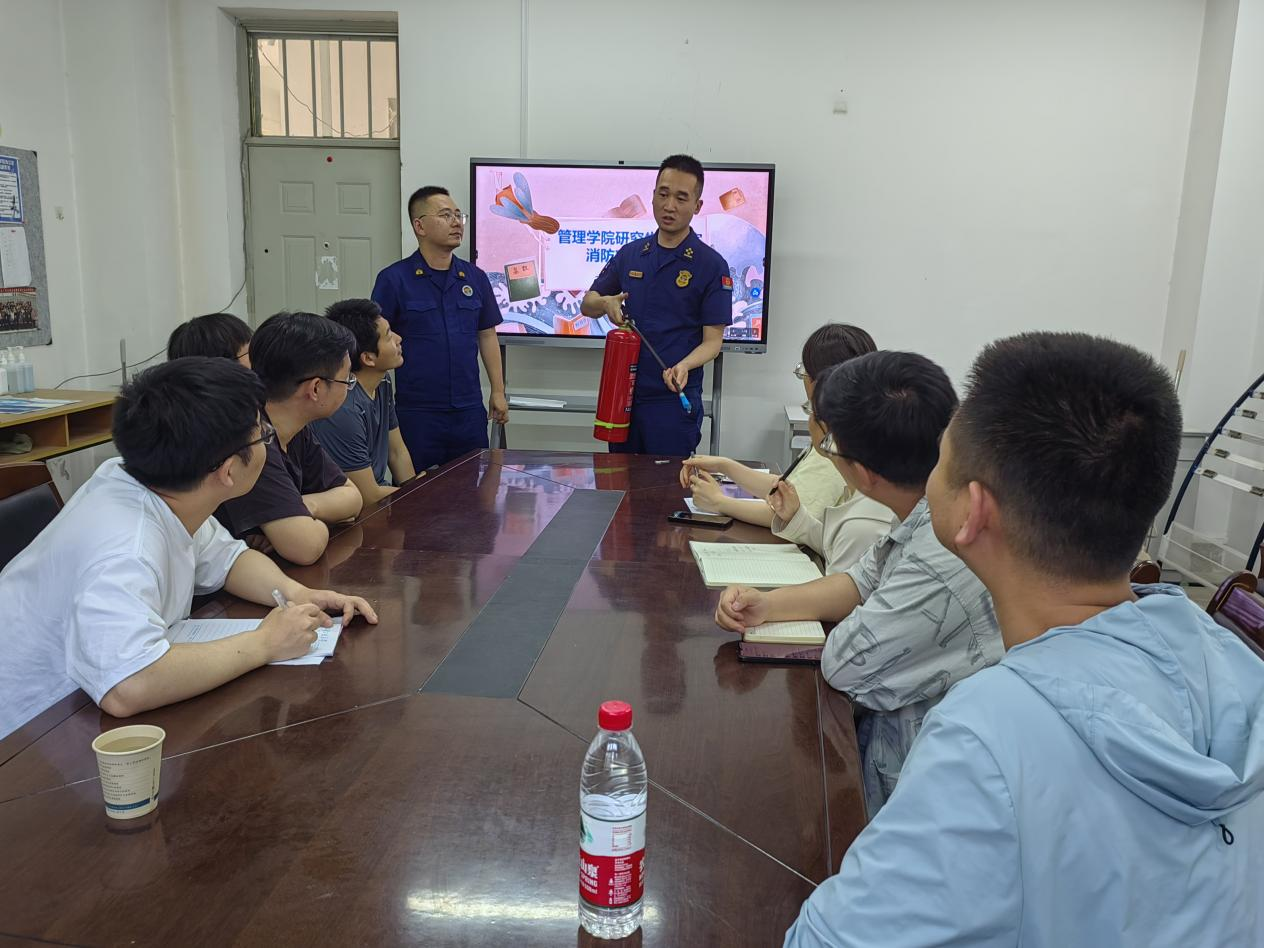 5月16日下午,suncitygroup太阳新城在人文管理楼226研讨室举办研究生工作室消防安全知识与技能培训,邀请西安市灞桥区消防救援大队马启瑞工程师一行四人来校宣讲并演示消防器材使用,suncitygroup太阳新城研究生辅导员王志刚及研究生代表10余人参加了培训。