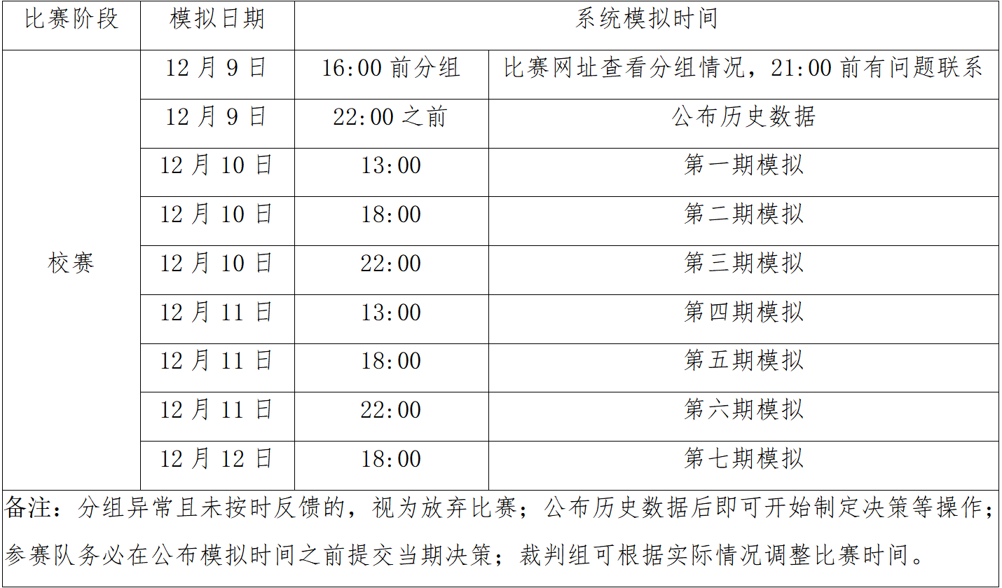 校赛报名截至时间为12月8日24时,校赛采用网络慢赛,具体安排见下表。