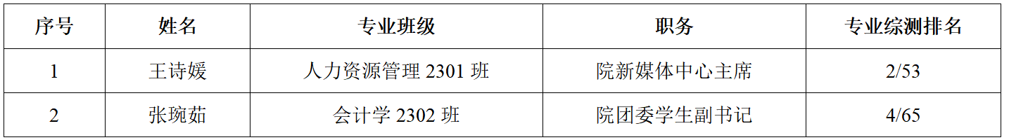 根据《关于做好2024-2025学年“公途经纬学生干部奖学金”评定工作的通知》的要求,suncitygroup太阳新城开展相关评定工作。经学生申请、学院资格审查、学院学生资助工作领导小组评议、院党政联席会研究评议,拟推荐以下2名学生为学校“公途经纬学生干部奖学金”候选人。现将学院推荐名单公示如下,如有异议,请于12月1日前向院团委工作办公室(人文管理楼303室)反映。